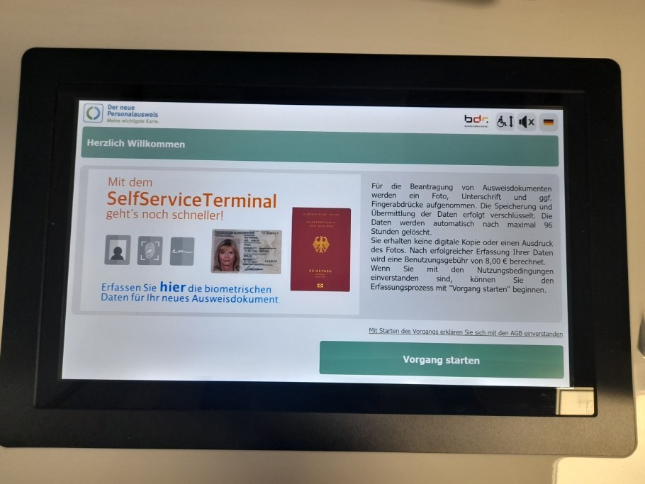 Seit letzter Woche können Bürgerinnen und Bürger mithilfe eines Self-Service-Terminals vor der Beantragung von Personalausweisen, Reisepässen und auch Kinderreisepässen ihr Passbild und ihre biometrischen Daten selbst erfassen.