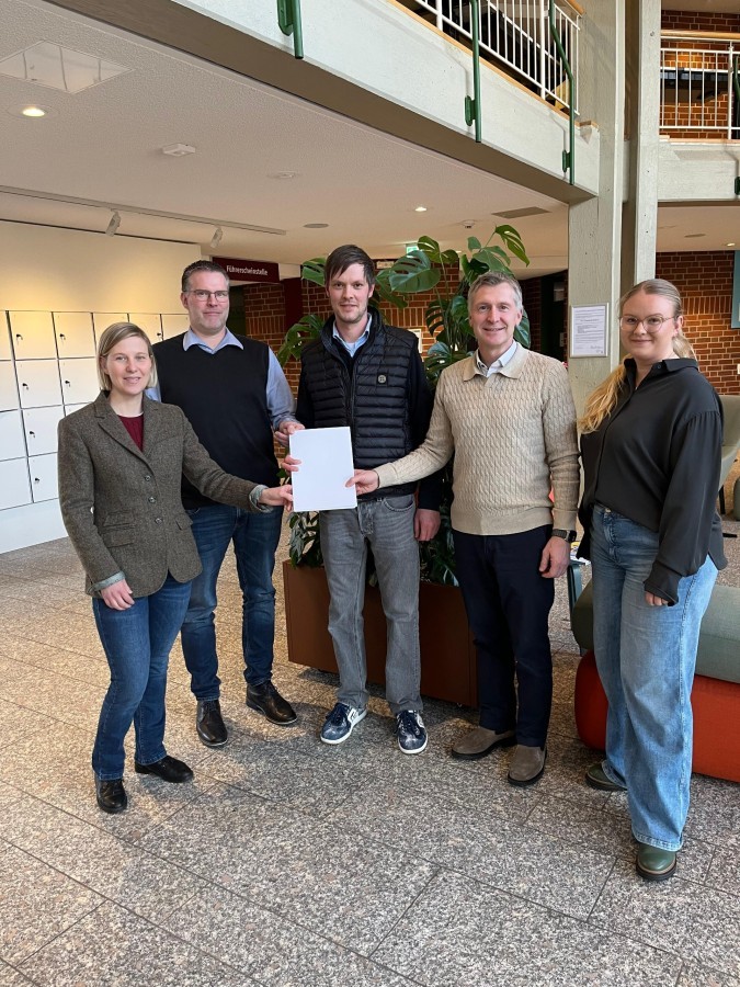 Zur offiziellen Bescheidübergabe wurden Sascha Jancke und Christian Tewes der WRJ Steuerberatungskanzlei ins Kreishaus nach Wildeshausen eingeladen. Der Förderbescheid wurde von Landrat Dr. Christian Pundt gemeinsam mit Christine Gronemeyer von der Wirtschaftsförderungsgesellschaft des Landkreises Oldenburg sowie Lisa Kersting, Wirtschaftsförderin der Gemeinde Hatten, überreicht.