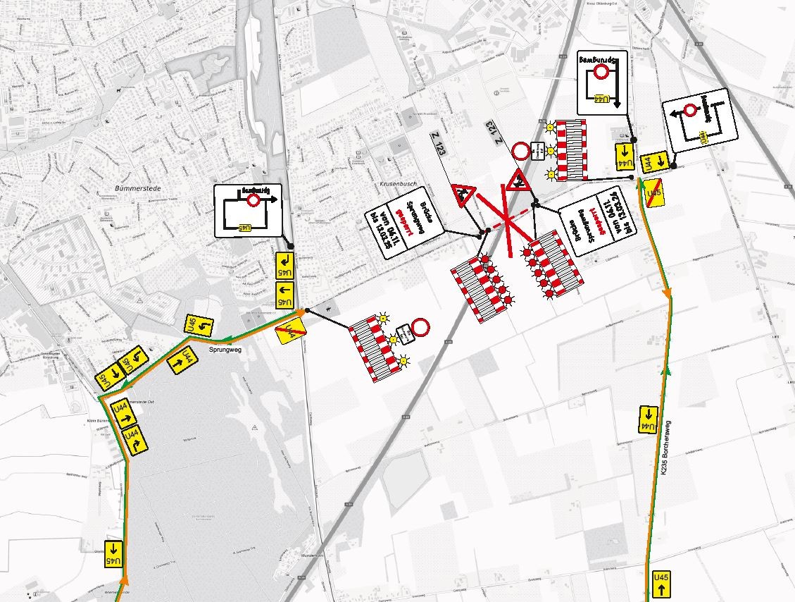 Aufgrund dessen kann es in dem o.g. Zeitraum im Streckenbereich Borchersweg – Mühlenweg – Bahnhofstraße – Bümmersteder Straße (siehe hierzu auch den beigefügten Verkehrszeichenplan) zu einem erhöhten Verkehrsaufkommen kommen.